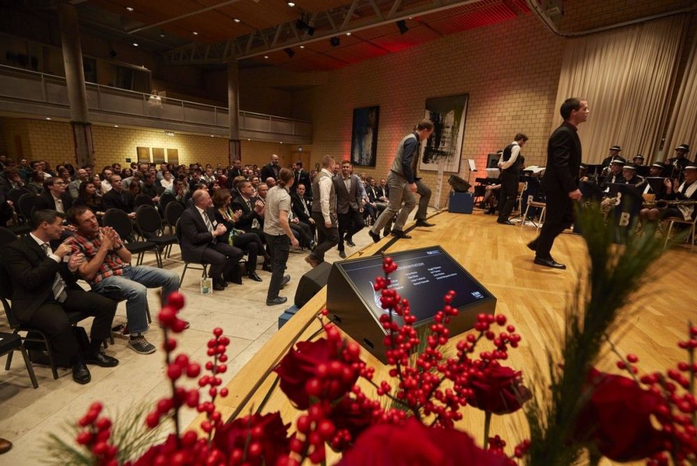 Die 81 prämierten Projektleiterinnen und Projektleiter Schreinerei kamen in drei Gruppen auf die Bühne. Als Beste wurden hier Francesco Riva (Novaggio mit Note 5,3), Elia Gosch (Bischofszell mit Note 5,2) und Roman Murer (Beckenried mit Note 5,1), alle drei Studierende der HF Bürgenstock, ausgezeichnet.