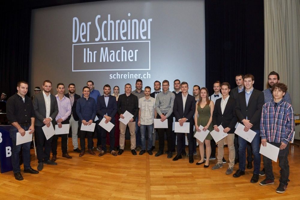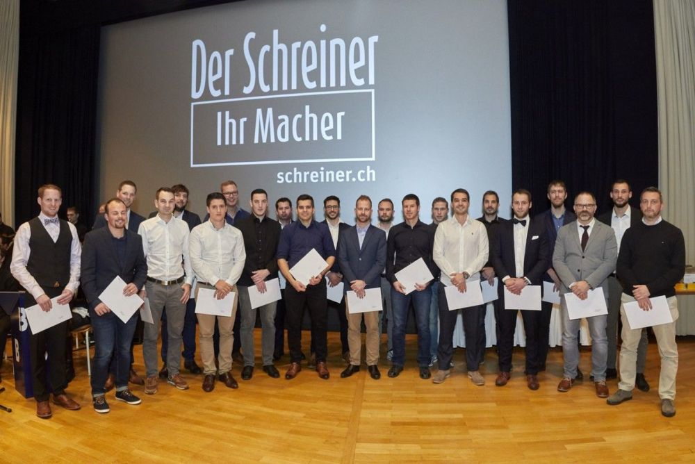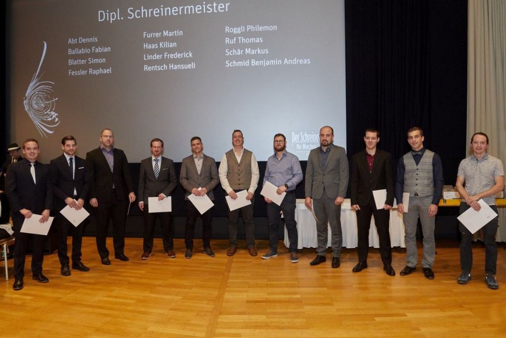 Die Schreinerinnen und Schreiner sind erfolgreich abgehoben. An diesem Abend haben sie ihre hart erarbeiteten Diplome entgegengenommen. Zwölf Männer dürfen sich nun eidgenössisch diplomierter Schreinermeister nennen. Als Zweitbester abgeschlossen hat HFB-Student Dennis Abt aus Bottmingen mit einer Note von 5.0. Er erhielt zusammen mit zwei weiteren Studierenden den Geistlich Leimpreis.
