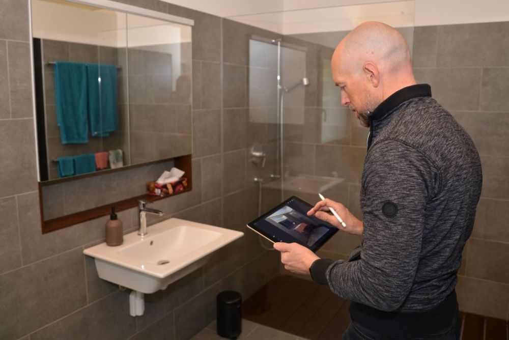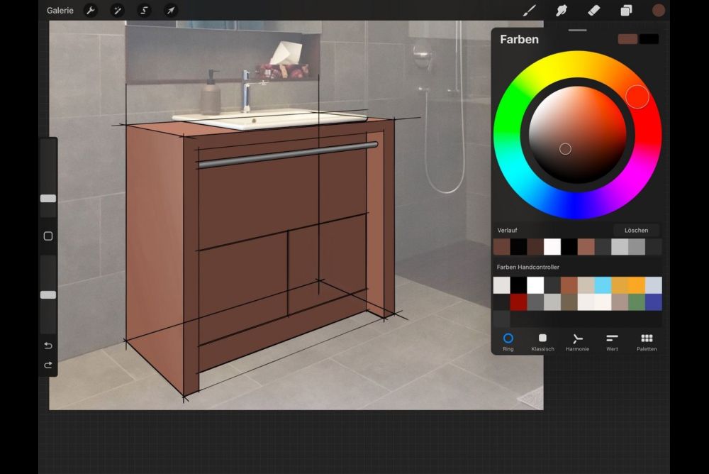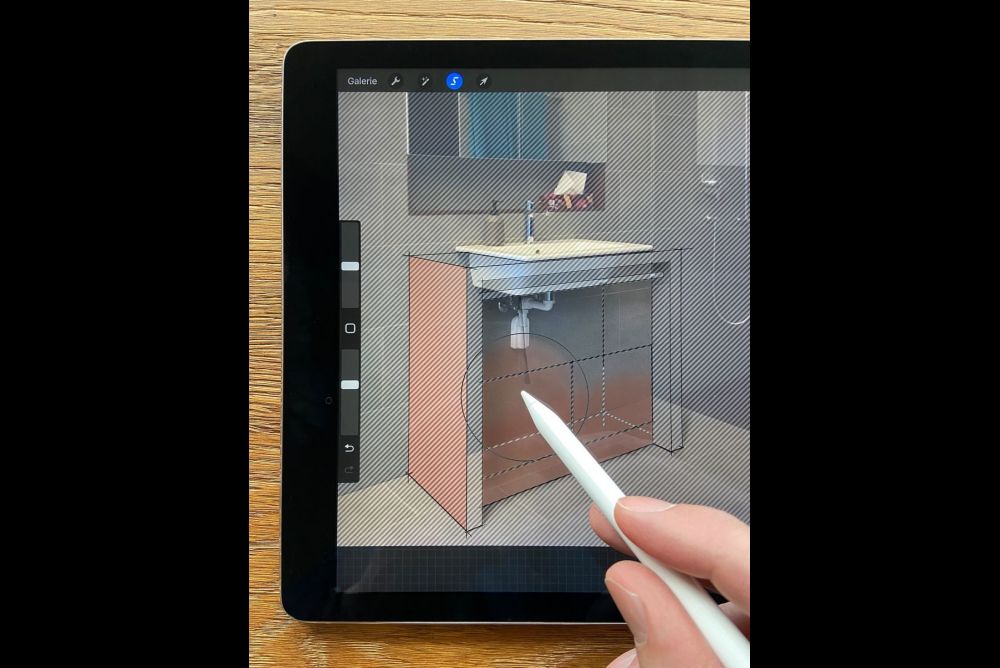 Ein zentrales Augenmerk legt der Referent auf eine wirkungsvolle Darstellungstechnik: «ich meine nicht, dass die Skizzen perfekt sein müssen. Ganz im Gegenteil. Ich muntere die Kursteilnehmerinnen und -teilnehmer auf, Hemmungen abzulegen, Fehler zuzulassen und vor allem auszuprobieren». Dank Magnetfunktionen werden Fehlerquellen wie krumme Linien und fehlerhafte Fluchtpunkte bei Perspektiven elegant aus dem Weg geräumt. Durch die Verwendung von Ebenen lassen sich Skizzen mit Farben, Texturen, Licht- und Schatteneffekten einfärben, sowie mit Bildern von Personen, Accessoires und Hintergründen kombinieren. Das direkte Zeichnen in Objektbildern ist ein weiterer Vorteil, wie sich am Beispiel des Badmöbels zeigt.
